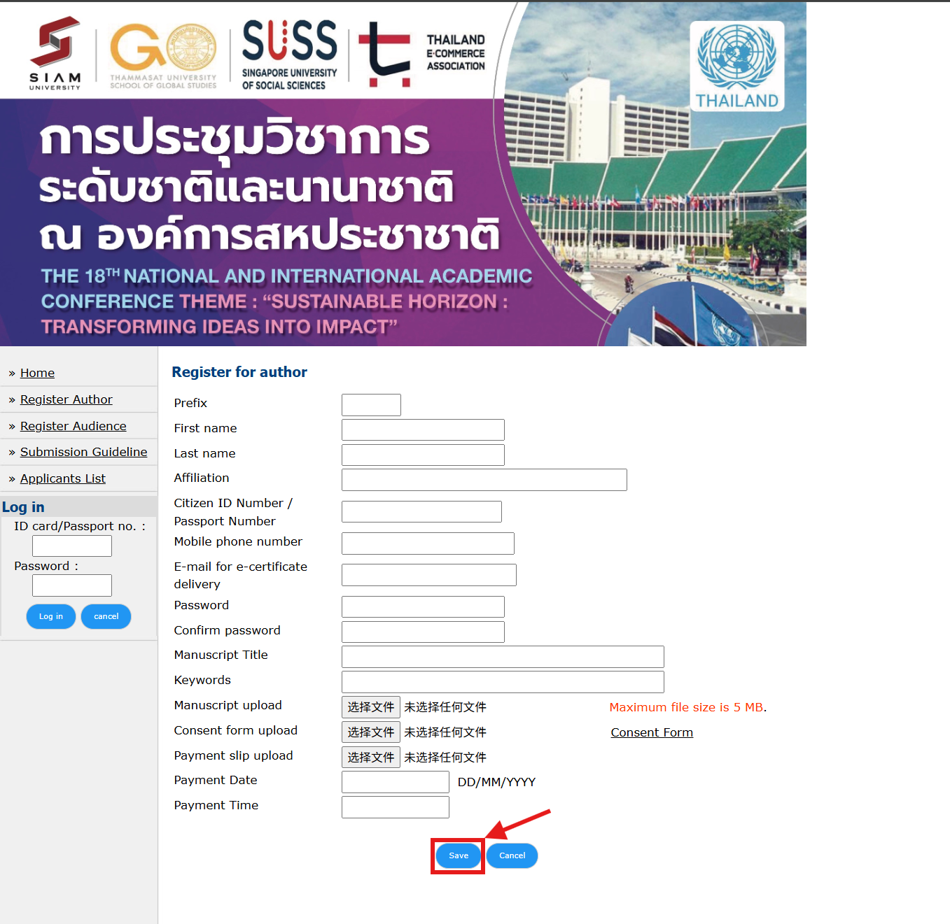 4. 点击左侧菜单栏中Register Author,按照页面上的信息要求进行填写。(特别注意其中三个需要上传文件的位置,分别是“文章Word文档”“同意书”“缴费凭证”)