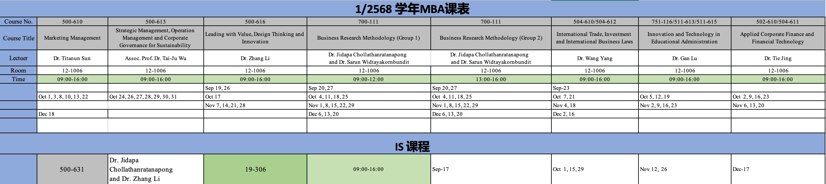 2568学年第一学期MBA课程安排 1/2568 Semester MBA Course Schedule