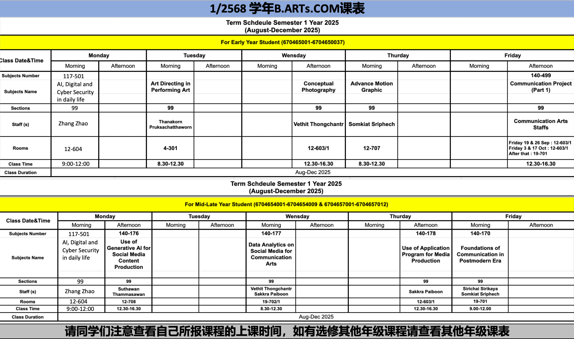 2568学年第一学期B.COM.ARTs(传媒学生)课程安排 1/2568 Semester B.COM.ARTs Course Schedule