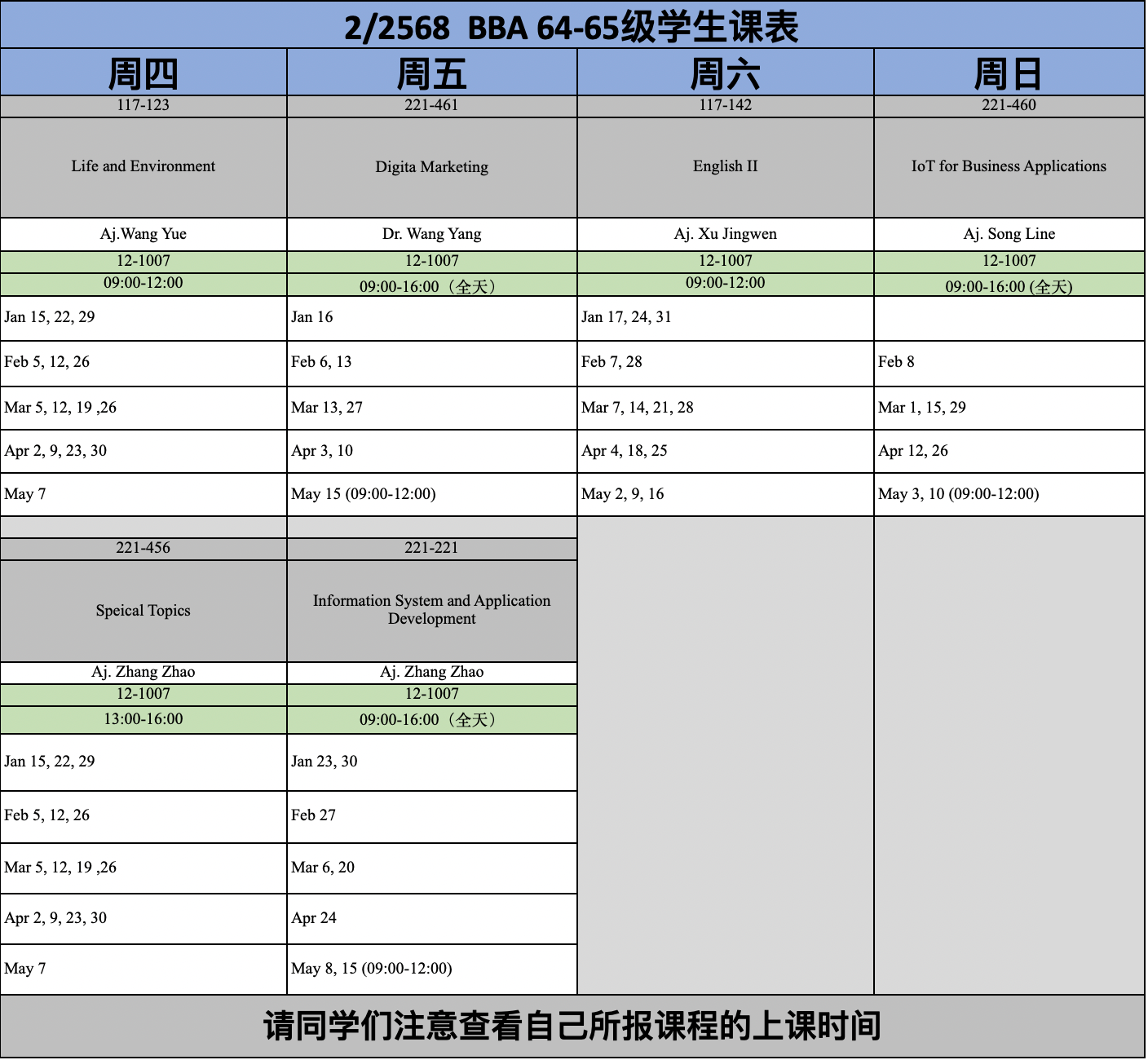 2568学年第二学期BBA(学号63,64,65学生)课程安排 2/2568 Semester BBA Course Schedule